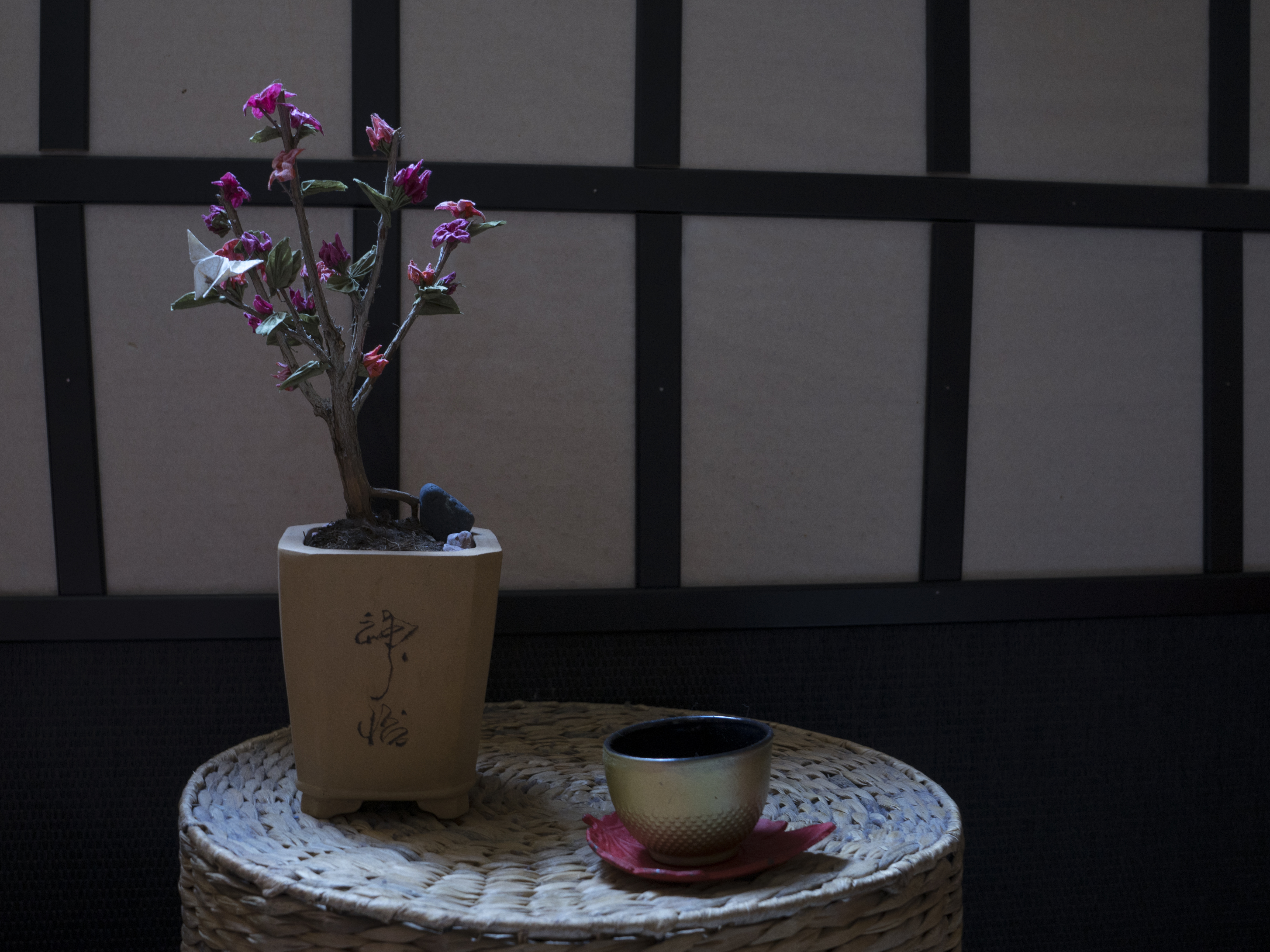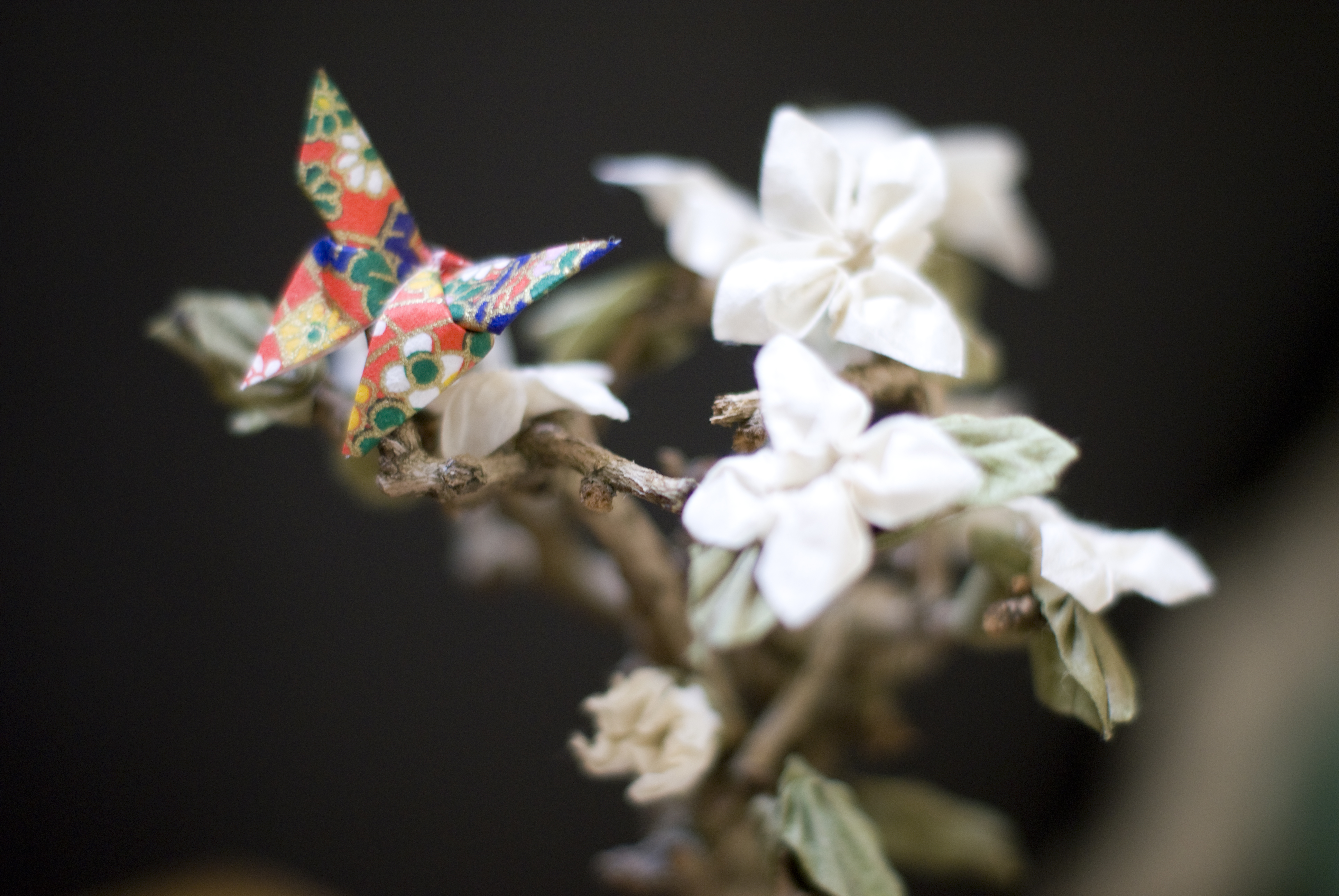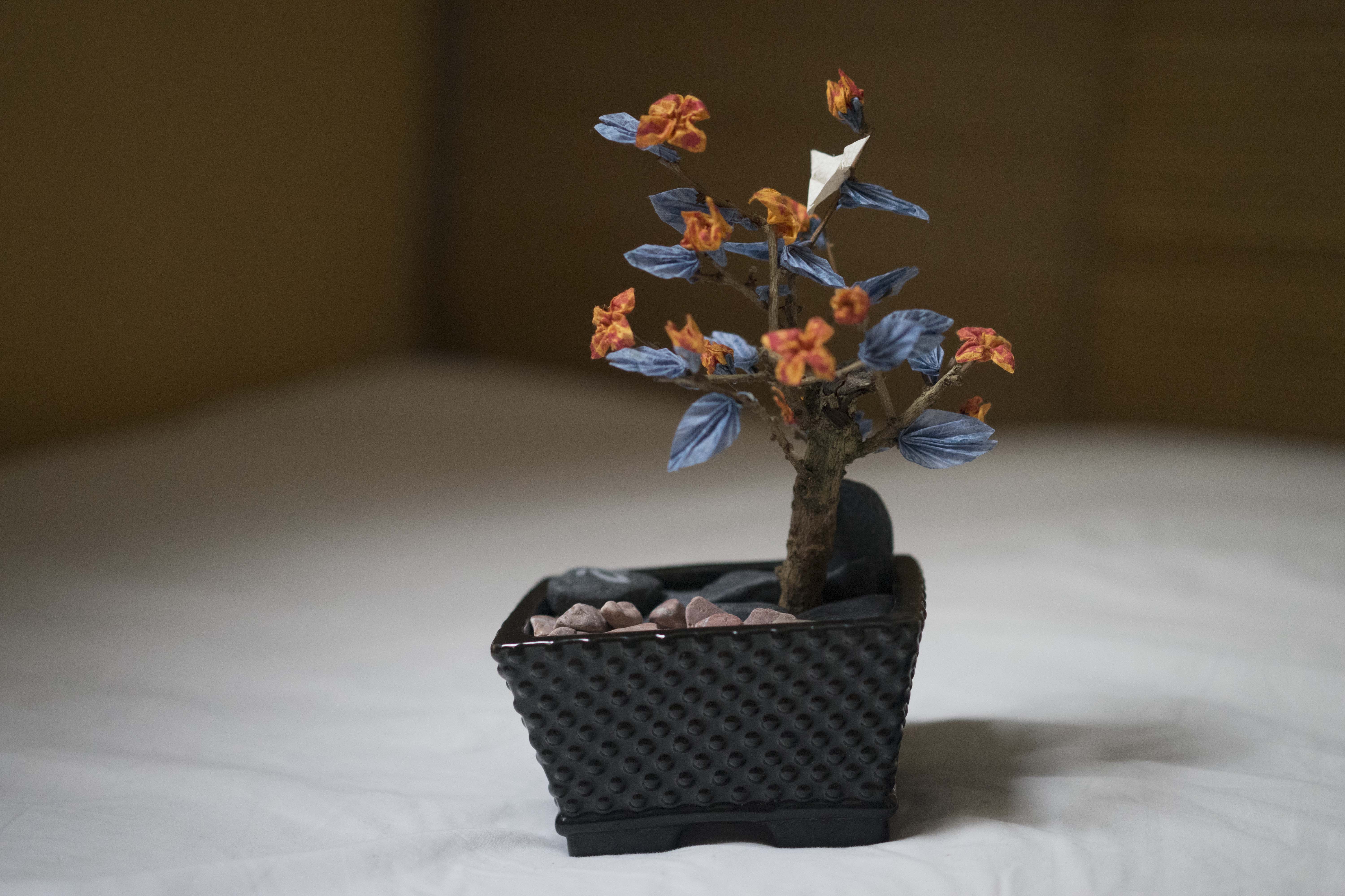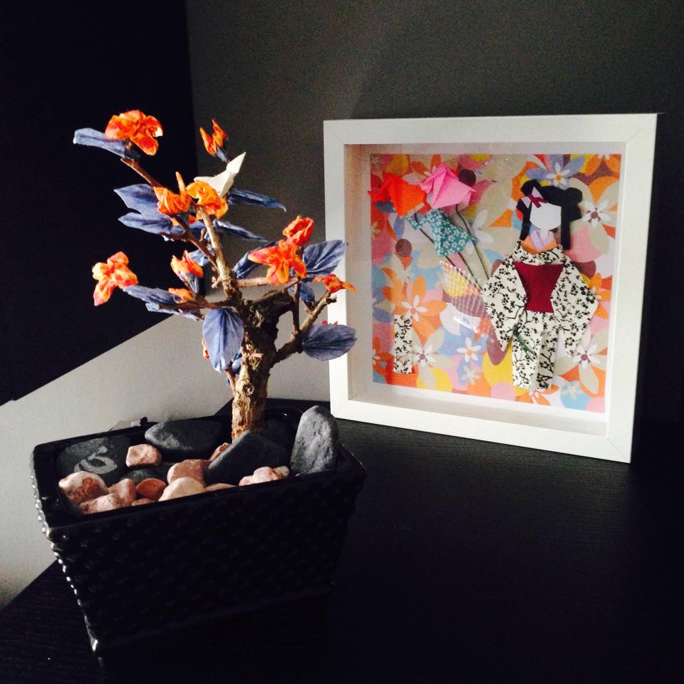 Para este bonsai doble 10 flores, 12 capullas y 20 hojas. Use un papel lofta encerado en dos tonos. ¿Y el secreto? No me gusta usar cuadrados perfectos para hacer las flores, asi salen cada una diferente y encantadoramente irregulares. Pero no hay que pasarse o sera imposible hacer el origami.