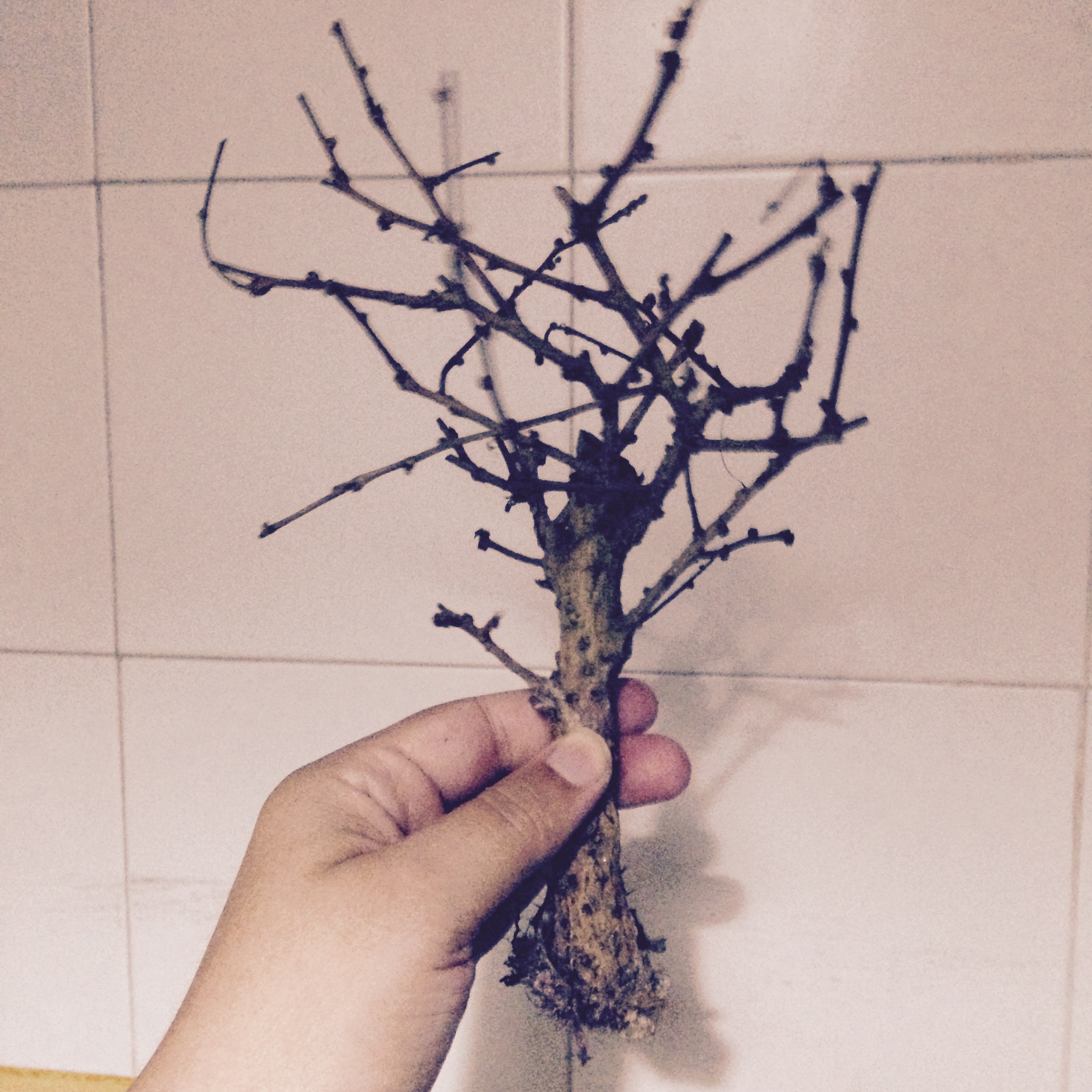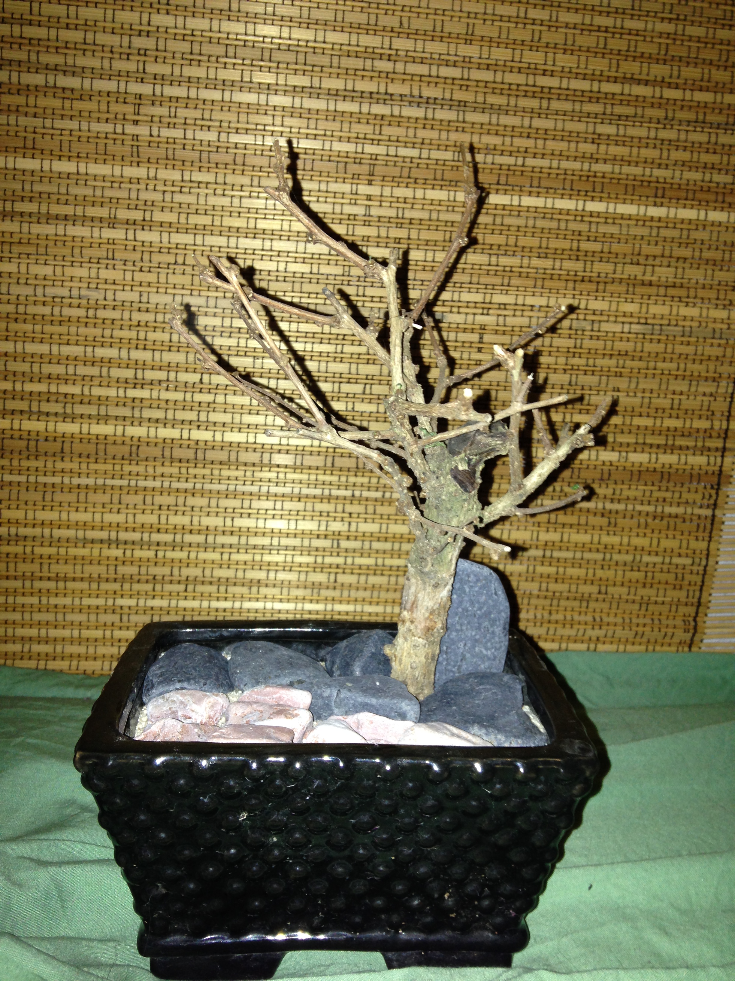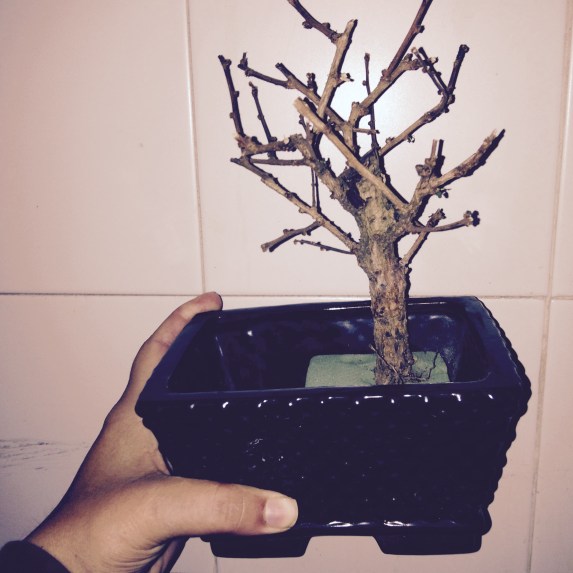 Y apareció. Solo tuve que contestar a esa llamada que uno siempre espera : tengo un cadaver para tí.. Mi amiga Monica de Quedeflores tenía un bonsai seco para mi, cosa rara, porque no se le seca ni una planta.