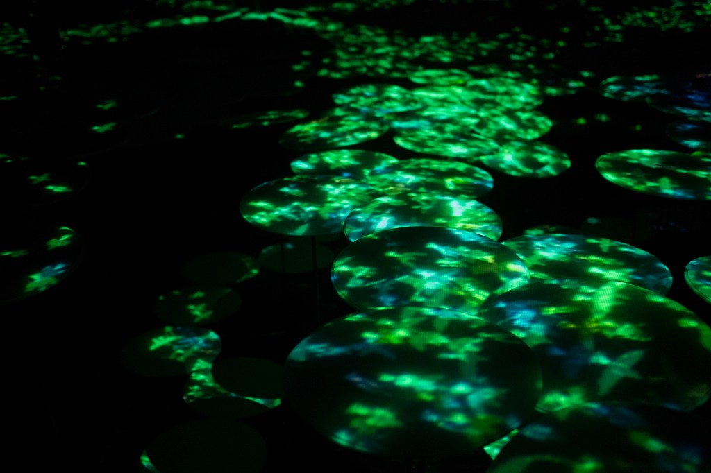 Quizás mi favorita fue «Memory of Topography» . Donde podías caminar entre plataformas redondas que alcanzaban hasta la rodilla. Estas setitas se bamboleaban a tu paso mientras reflejaban el paso de diferentes estaciones. Y la música y el sonido de los animales acompañaba música y sonidos que evolucionaban junto con las estaciones. Porque todas las sensaciones aquí van completadas por el sonido.