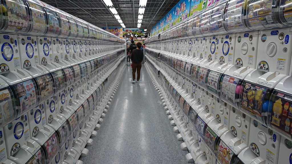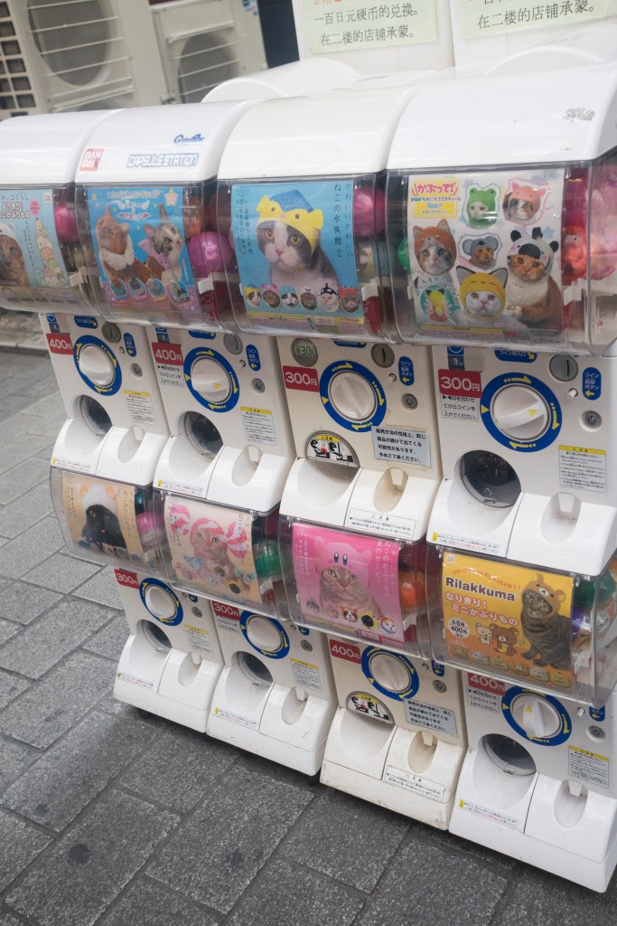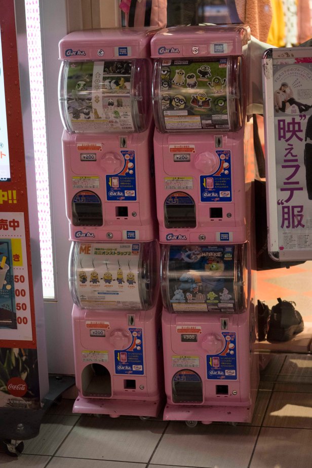 Mientras aquí se han extinguido, dejándome traumas infantiles con el rosa… en Japón, que vive a su propio ritmo, no solo se mantienen, han evolucionado y puedes cruzarte tanto con el clásico puramente mecánico como con todo un mundo de evoluciones tecnológicas, futuristas… Las maquinas de Gashapon, brotan y brotan como hongos a la sombra.
