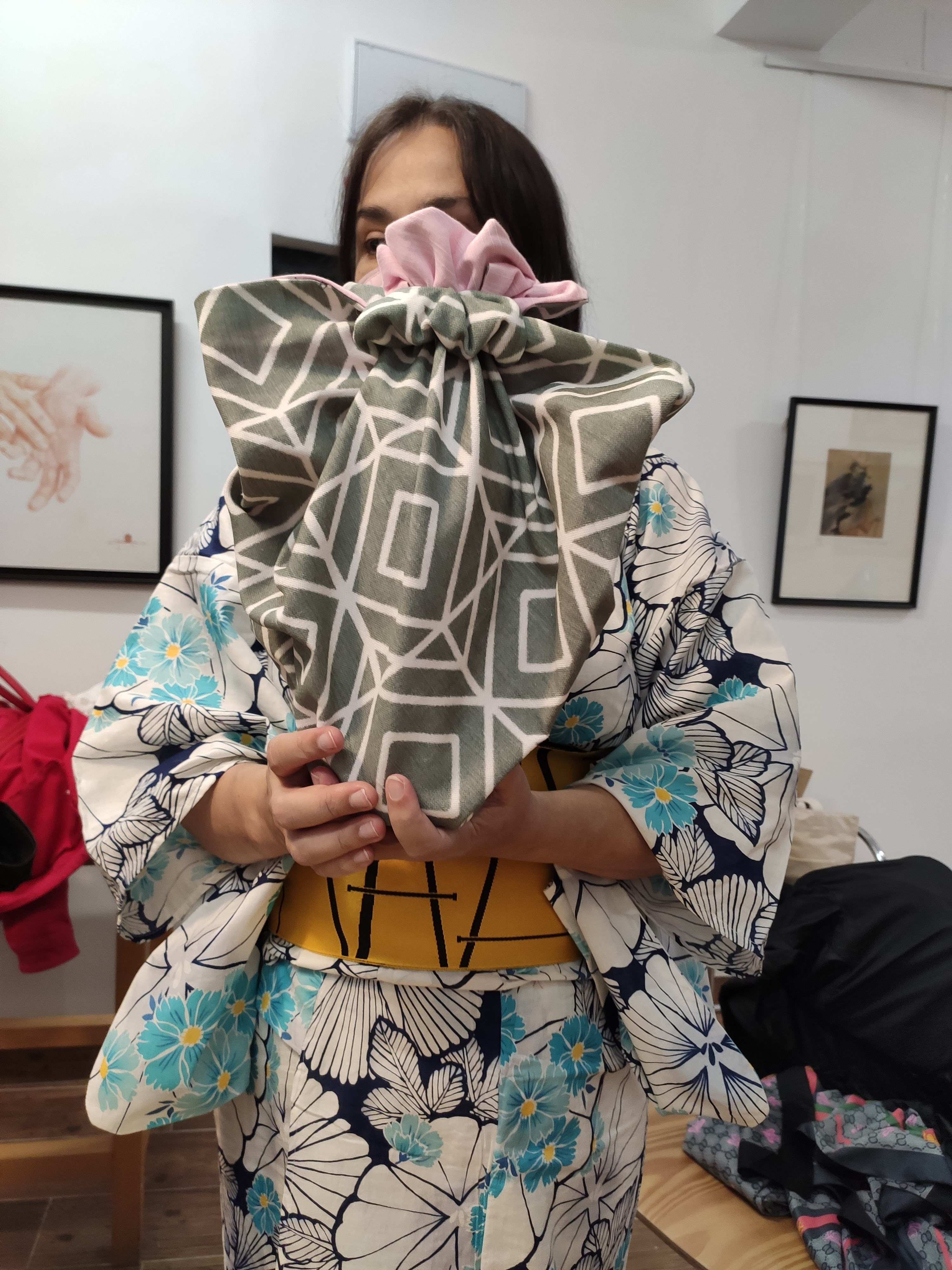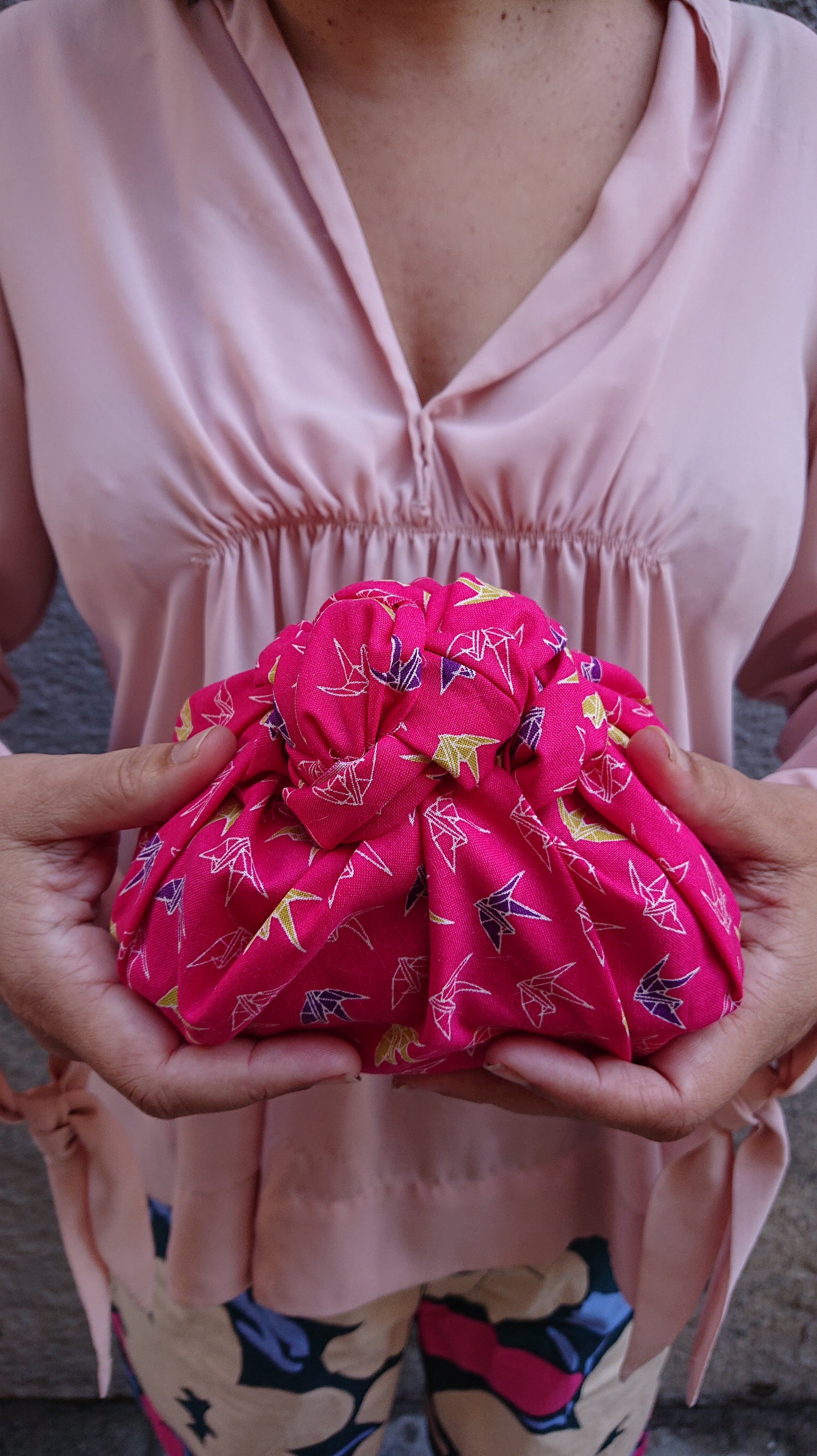 Desde ese atillo primitivo para mantener la ropa seca y a salvo, se desarrollo toda una técnica para envolver regalos, crear bolso y transportar todo tipo de enseres. Con un claro trasfondo de reutilización, con un trozo de tela, tradicionalmente cuadrado, y solamente pliegues y nudos que deshacer cuando acabe ese uso y así permitir otros mil distintos.
