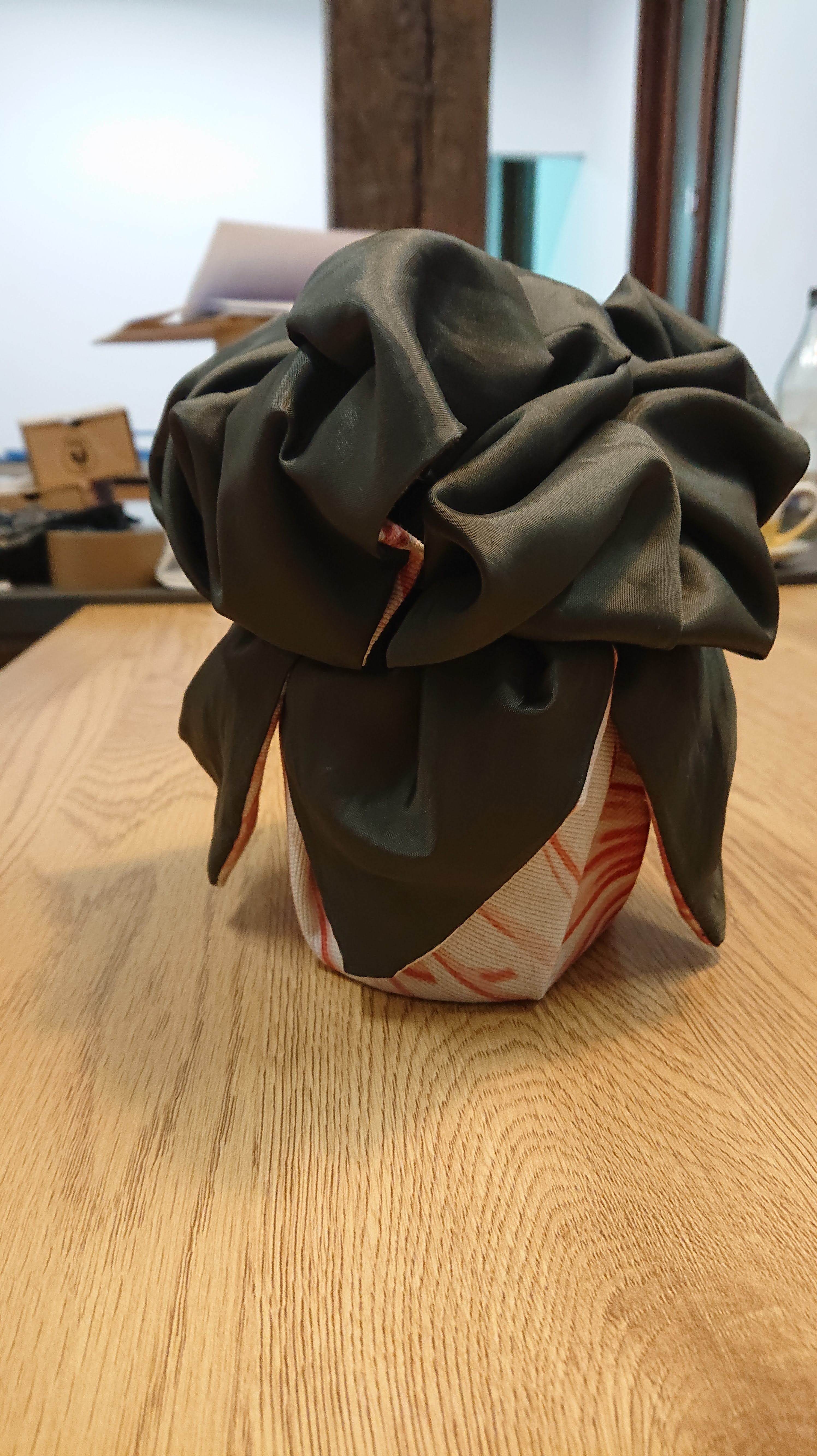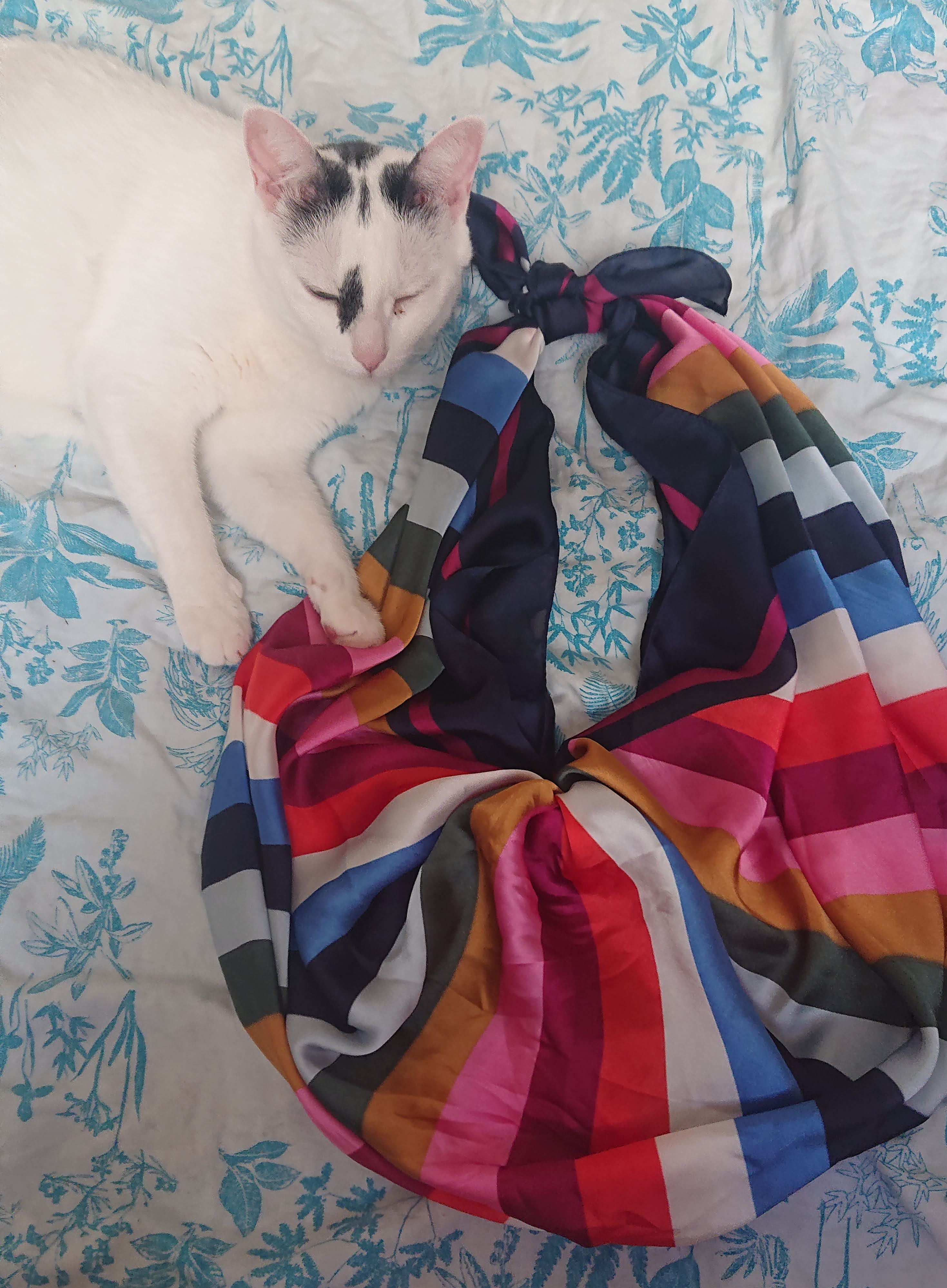 Yo uso pañuelos, trapos de cocina, lonetas que preparo yo misma con un forro para poder hacer patrones bicolores más interesantes… Todo vale. Desde un cuadrado de tela de algodón sin dobladillo al más exquisito pañuelo de sarga de seda firmado por Hermés.