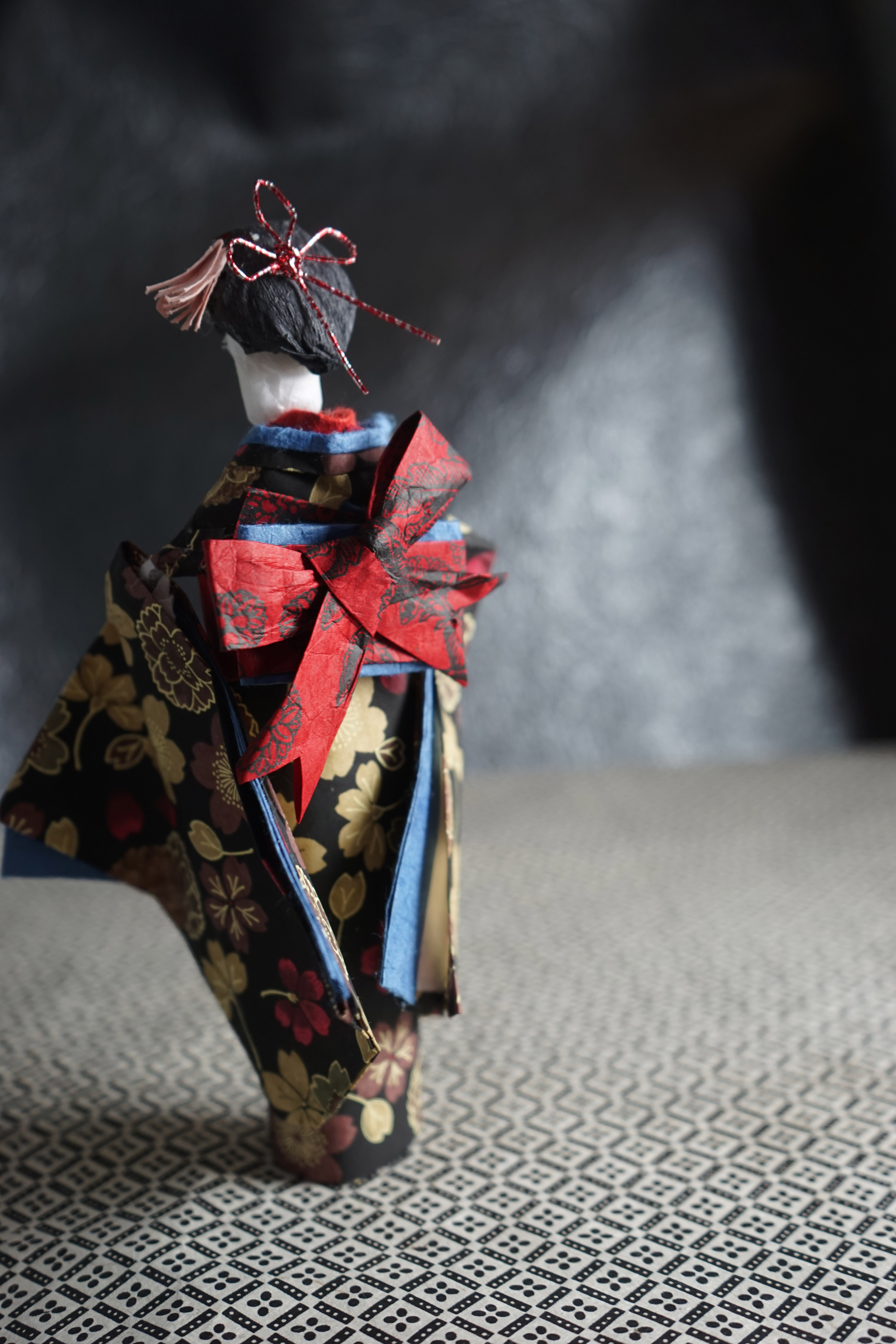 Para abril, haremos una muñeca muy especial mezclando las técnicas de cortado del Kurumi – e que use en esta muñeca yokai , con tecnicas de plegado de origami, para conseguir un efecto más dinámico.